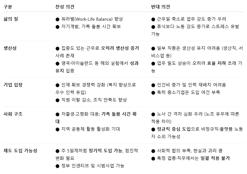 주4.5일제 도입에 대한 찬성, 반대 의견
