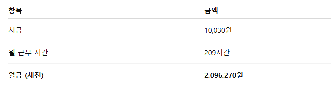 즉, 주 5일 하루 8시간 근무 시 약 209만 원이 최저 월급 기준이 됩니다.