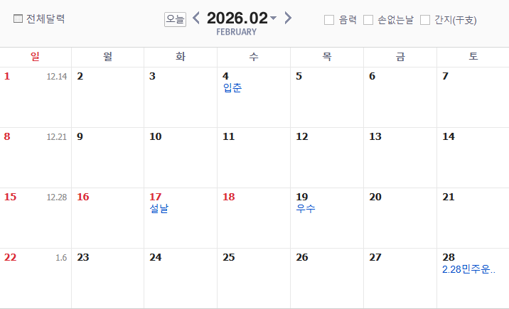 2월 14일(토) ~ 18일(수): 설날 연휴(주말 포함)