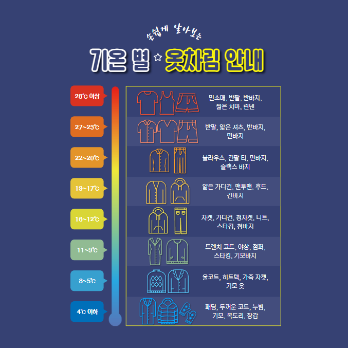 날씨는 매일 바뀌지만, 기본적인 온도에 맞는 옷차림을 미리 알고 있다면 하루가 훨씬 더 편안해집니다.