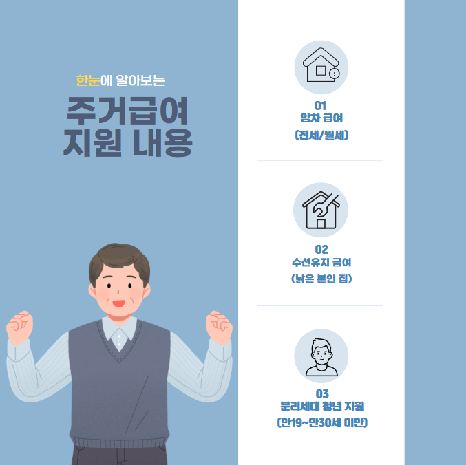 임차급여나 수선유지급여를 받는 수급가구 내에 있는 만 19세 이상 30세 미만의 미혼 청년 분리세대라면 따로 주거급여를 지급받을 수 있습니다.
