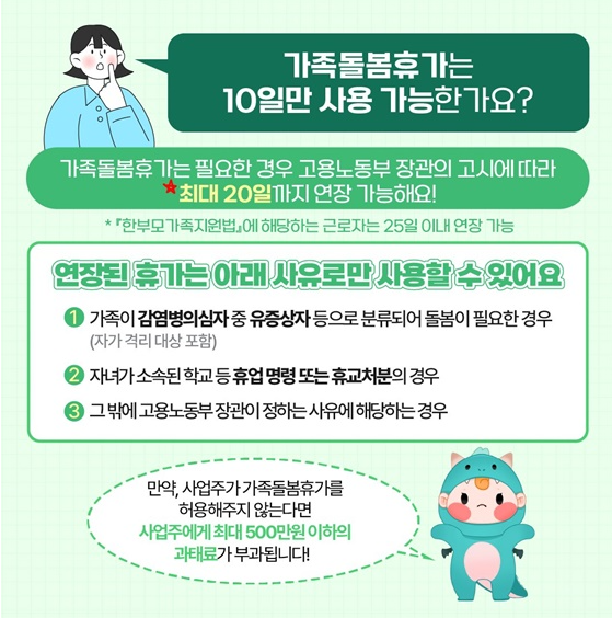 또한 감염병 등 재난 상황 시에는 고용노동부의 고시에 따라 최대 20일, 한부모 근로자는 25일까지 연장 가능합니다.