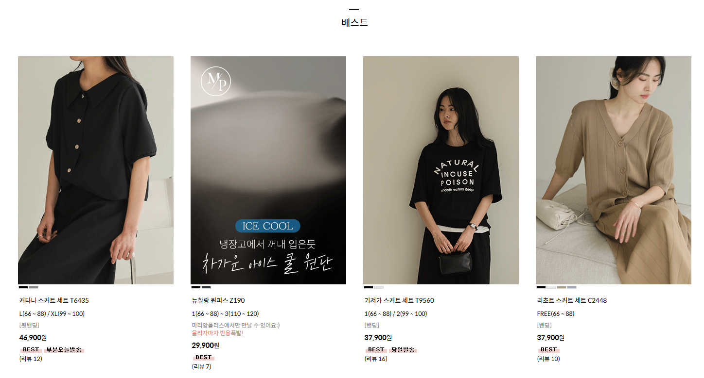 특징: 체형 보완에 탁월한 디자인, 깔끔하고 실용적인 옷이 많음
