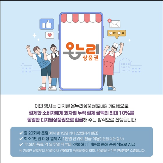 매주 정해진 기간 내 상품권을 사용할 경우, 결제 금액의 최대 10%를 다시 디지털 상품권으로 환급해주는 행사입니다.