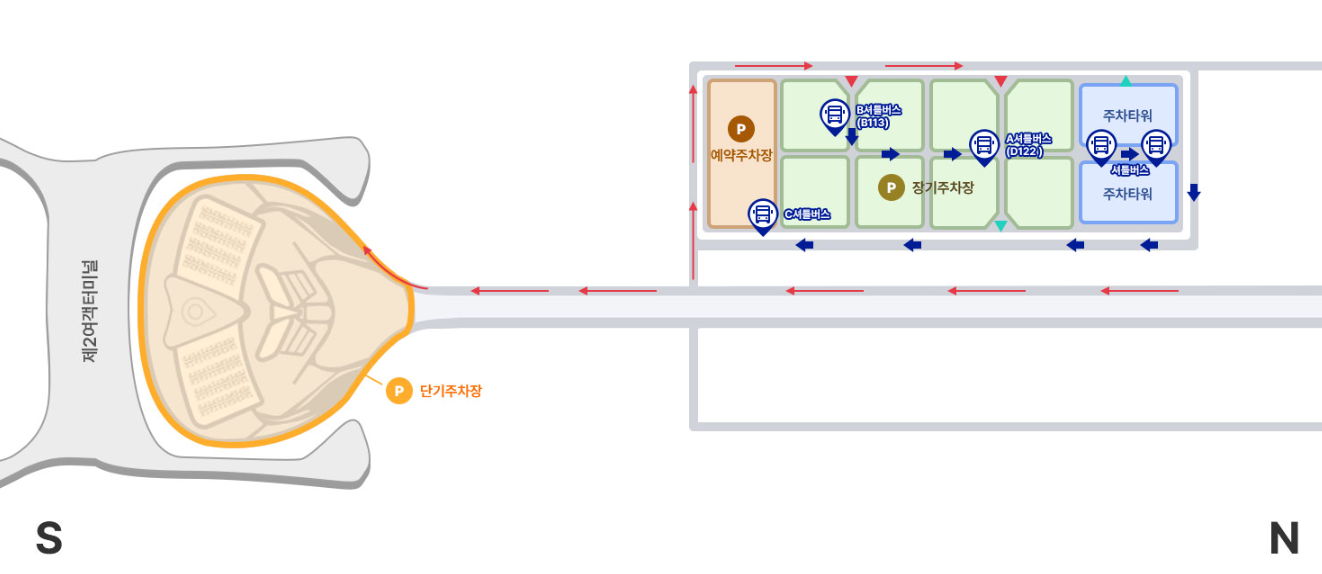 장기주차장 또는 예약주차장은 여객 터미널에서 거리가 좀 있습니다.