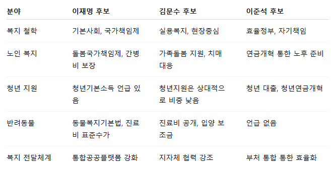 후보별 복지 공약 요약 비교표